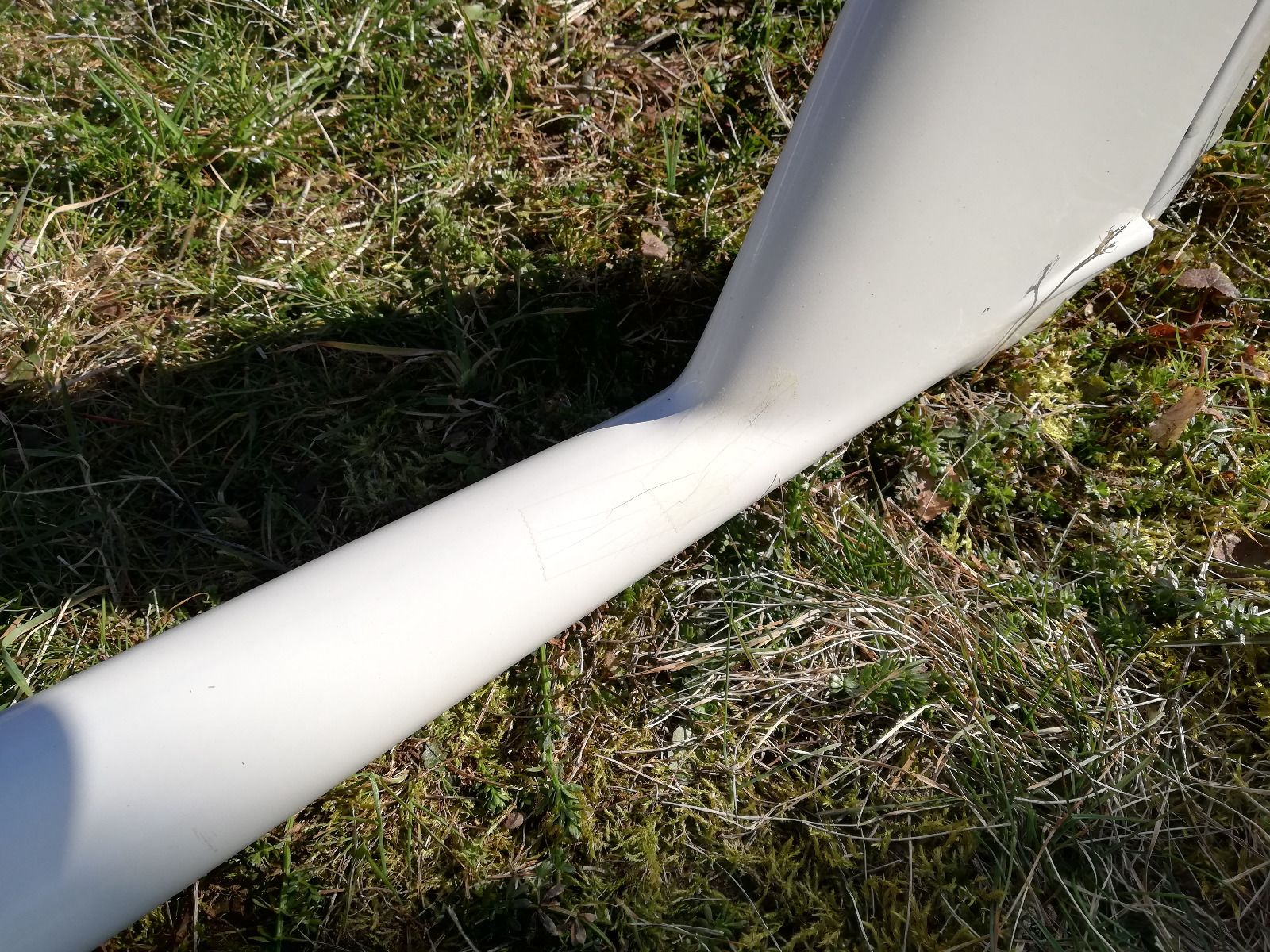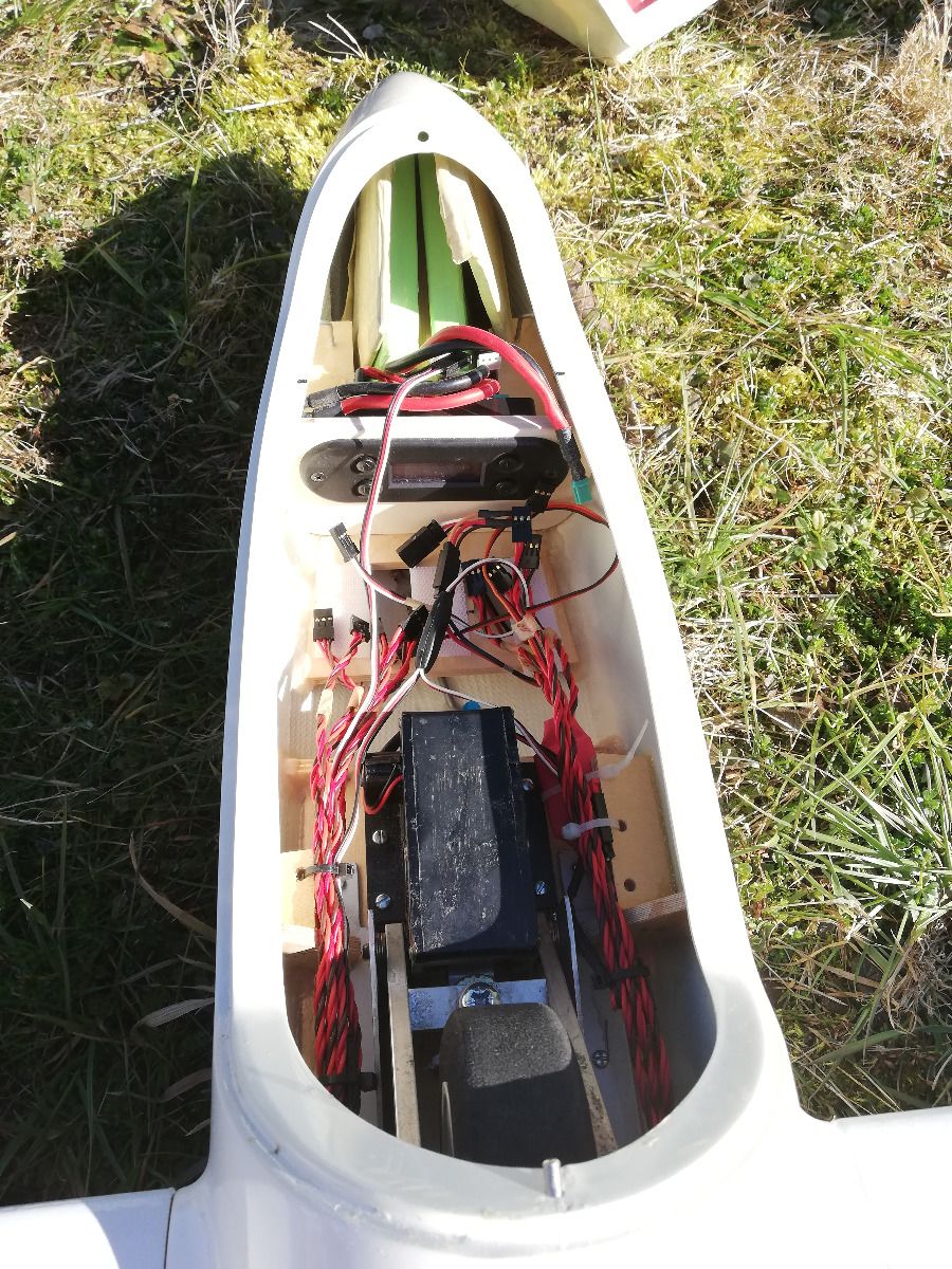 Alle Flügelservos sind Futaba 3150, die eine Störklappe funktioniert nicht. Der Rumpf hat im Seitenleitwerksübergang ein paar Risse, bin aber so geflogen. Mein Vorgänger hat den Rumpf auch mal neu lackiert. Das Einziehfahrwerk (Giezedanner) und das Dpsi Bic verbleiben auch im Modell. Dazu gibt es noch 2x einen LiFe Akku, dieser ist jedoch ca. 5 jährig.